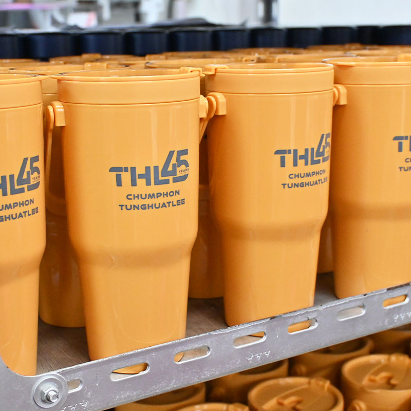 วัสดุ : แก้วเก็บความเย็น 2 ชั้น สแตนเลส นอก 201 ใน 316 พร้อมหูหิ้วและยางกันลื่น