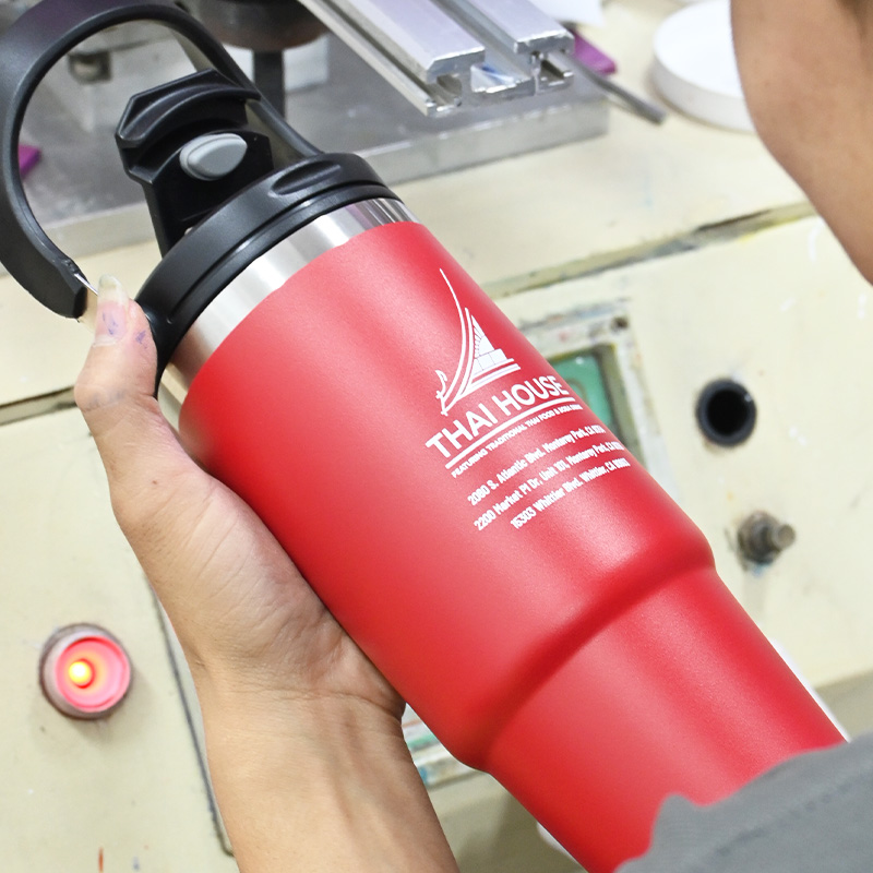 ผลงานกระบอกน้ำ สกรีนโลโก้ THAI HOUSE