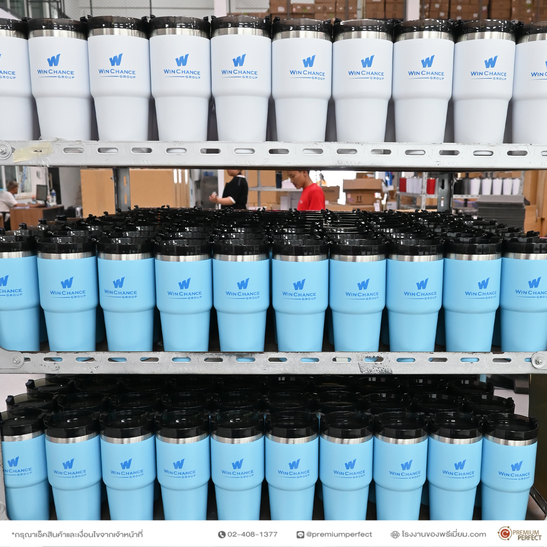 ผลงานกระบอกน้ำ สกรีนโลโก้ WIN CHANCE GROUP