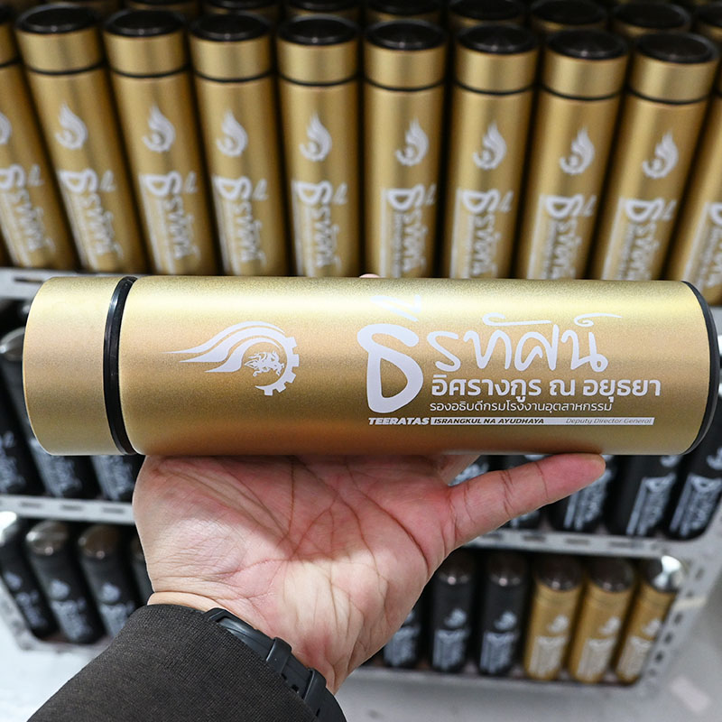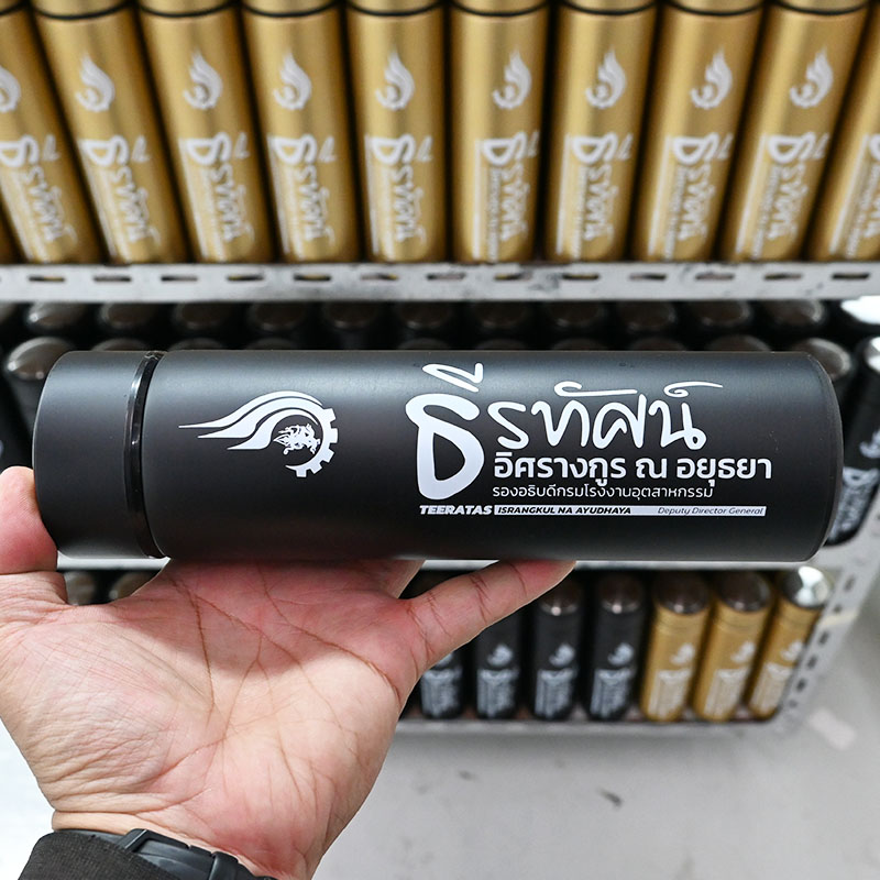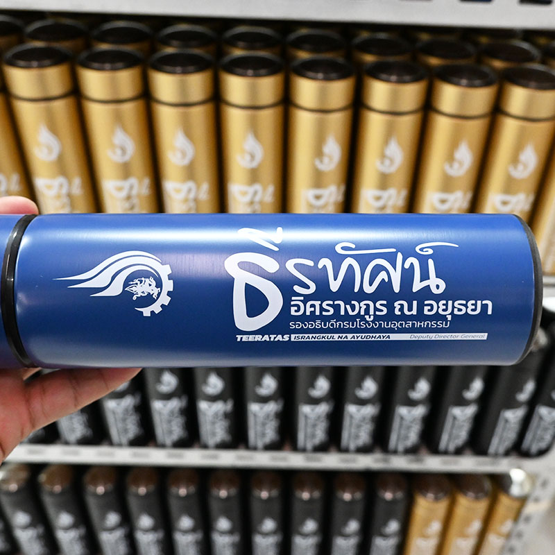 ผลงานกระบอกน้ำ สกรีนโลโก้ ธีรทัศน์ อิศรางกูร ณ อยุธยา